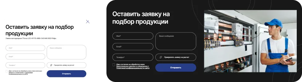 Новый сайт получил возможность оформления онлайн-заказов. Пользователи могут добавлять товары в заявку или отправлять свои сметы с требуемым оборудованием на просчет стоимости. Все заявки с сайта отправляются на почту менеджерами компании.
